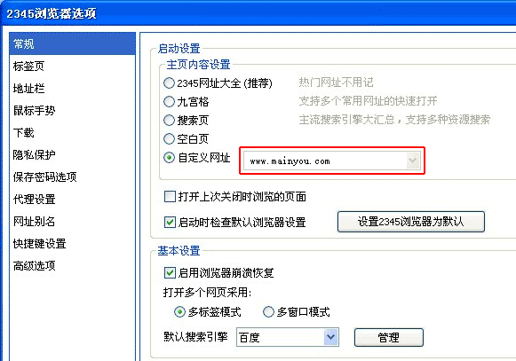 提示:若仍无法设置主页,请点击查看“主页修复”;或“把漫游网址导航下载到桌面” 2345浏览器