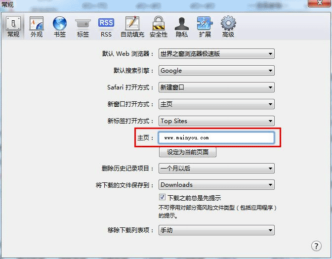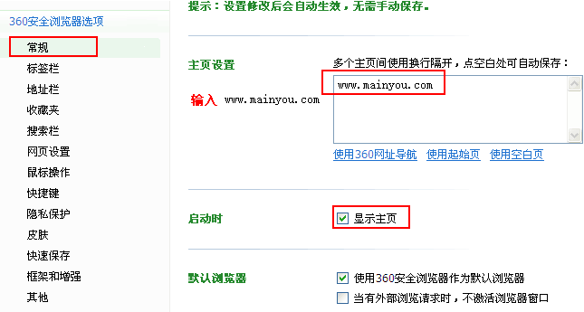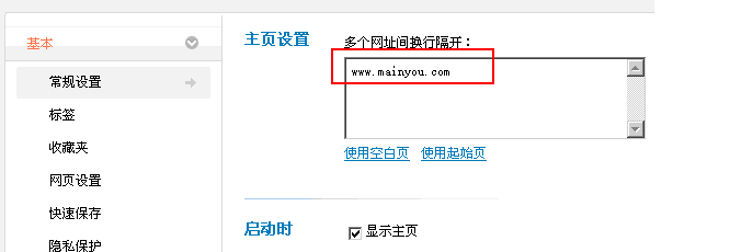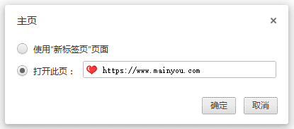 2)然后在打开的对话窗口中的主页设置的地址输入框中输入“https://www.mainyou.com/”设置修改后会自动生效,无需手动保存。如图所示: