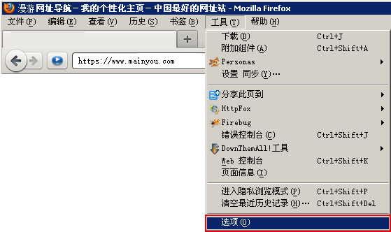 火狐(Firefox)浏览器设置主页的方法: 1)首先,打开浏览器上部菜单栏的“工具”栏,在下拉列表中选择“选项”,如下图所示: