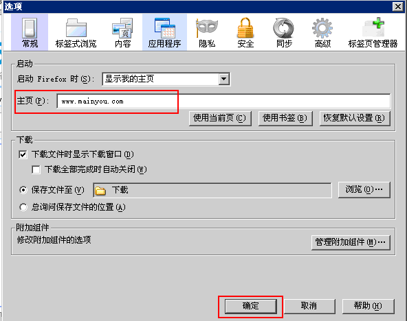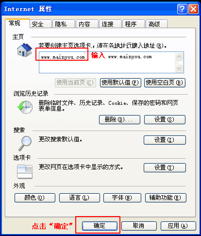 然后在打开的对话窗口中的主页栏的地址输入框中输入“https://www.mainyou.com/”,然后点击窗口下方的“确定”按扭即可,如下图所示: