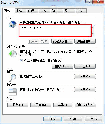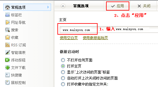 2)然后在打开的对话窗口中的主页栏的地址输入框中输入“https://www.mainyou.com/”,然后点击窗口上方的“应用”按扭即可,如下图所示: