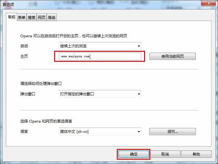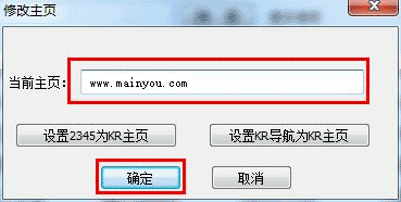 2)然后在打开的对话窗口中的主页设置的输入框中输入“https://www.mainyou.com/”即可