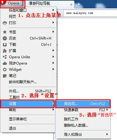 Opera浏览器设置主页的方法: 1)首先,点击左上角菜单按钮,在下拉列表中选择“设置”—“首选项”,如下图所示: