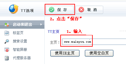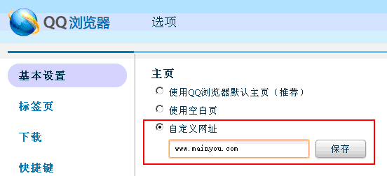 2)然后在打开的对话窗口中的主页栏的地址输入框中输入“https://www.mainyou.com/”,然后点击窗口上方的“保存”按扭即可,如图所示: