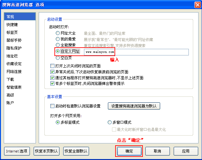 2)然后在打开的对话窗口中选择“自定义网址”,在后面的对话框中输入“https://www.mainyou.com/”,然后点击窗口下方的“确定”按扭即可,如下图所示: